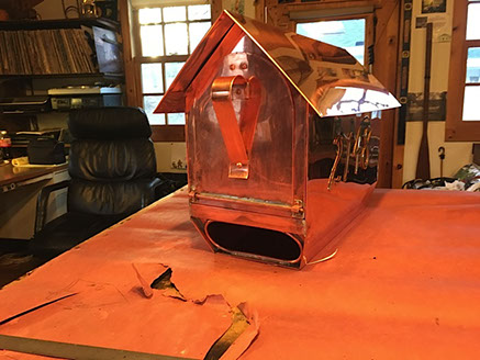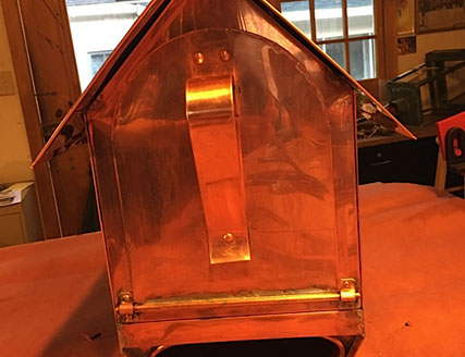 Copper Shop mailboxes require over 6-feet of soldered joints. I use copper sheet, rod, and tube on each. All mailboxes, including the hinges, are hand made here at the shop. Some get brass washers hidden in the hinge for strength.